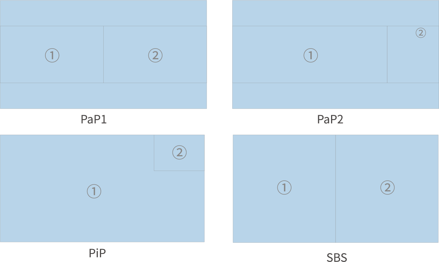 Функция PaP может быть использована для одновременного просмотра двух независимых источников сигнала на одном экране. С функцией PiP второй сигнал может отображаться над основным сигналом, размер и положение окна PiP могут быть отрегулированы. В четырехэкранном режиме на экране монитора могут отображаться четыре источника сигнала, расположенных в форме «田». Это очень полезно, когда необходимо одновременно просматривать несколько изображений (например, в нескольких режимах).